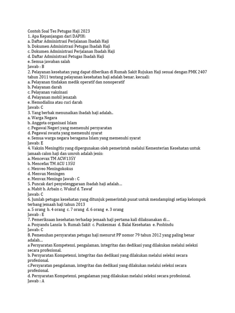 Dengan berlatih 50 contoh soal CAT petugas haji di atas, peserta dapat mengukur kesiapan diri sekaligus memperdalam pemahaman tentang tugas dan tanggung jawab sebagai pelayan jemaah.